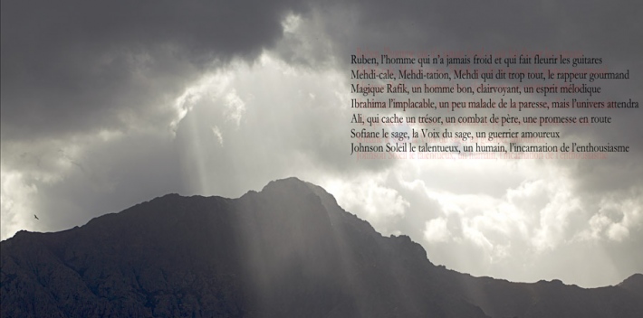 Bilan :Ils étaient sept, sept visages qui se sont épanouis, contents d’être là et pas seulement de ne pas être ailleurs, motivés, surpris, attentifs, solidaires, et pour certains, ce qu’ils ont fait relève de l’incroyable. Ali en larmes en écoutant sa lettre chantée, Sofiane illuminé des mots qu’il a réussi à extraire de ses sentiments, Rafik en transe pendant l’enregistrement et se balançant comme un ours, Ruben, c’est une guitare rehaussée d’un sourire, Ibrahima, notre bougon de service qui n’a jamais réussi à camoufler son plaisir, Mehdi le dur, le caïd, qui buvait mes conseils techniques comme du petit lait, et enfin, Johnson, notre soleil à tous, talentueux, lumineux et fédérateur. Ce garçon là, c’est l’incarnation du mot « enthousiasme » qui signifie littéralement « Dieu en soi ».