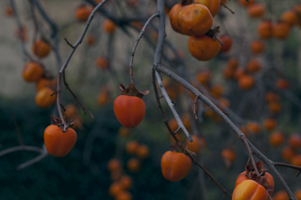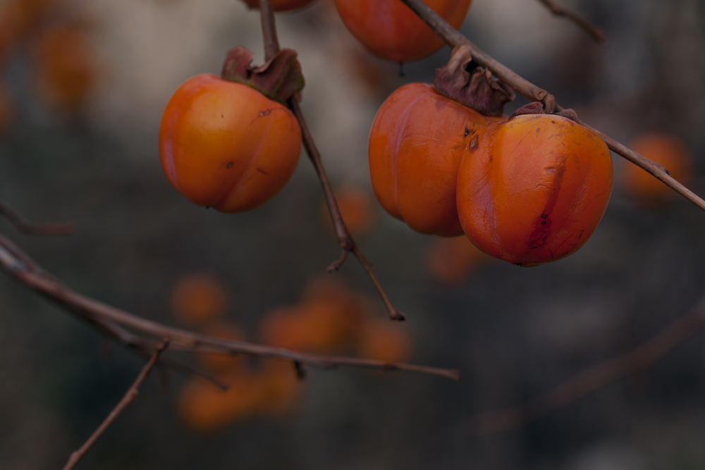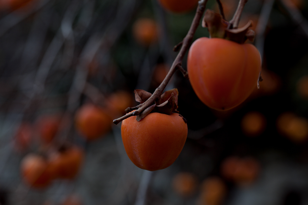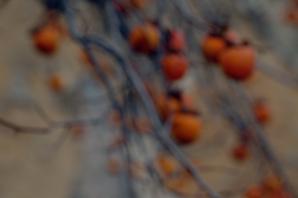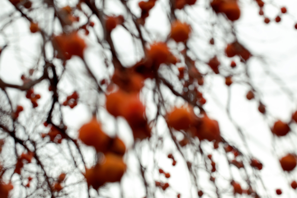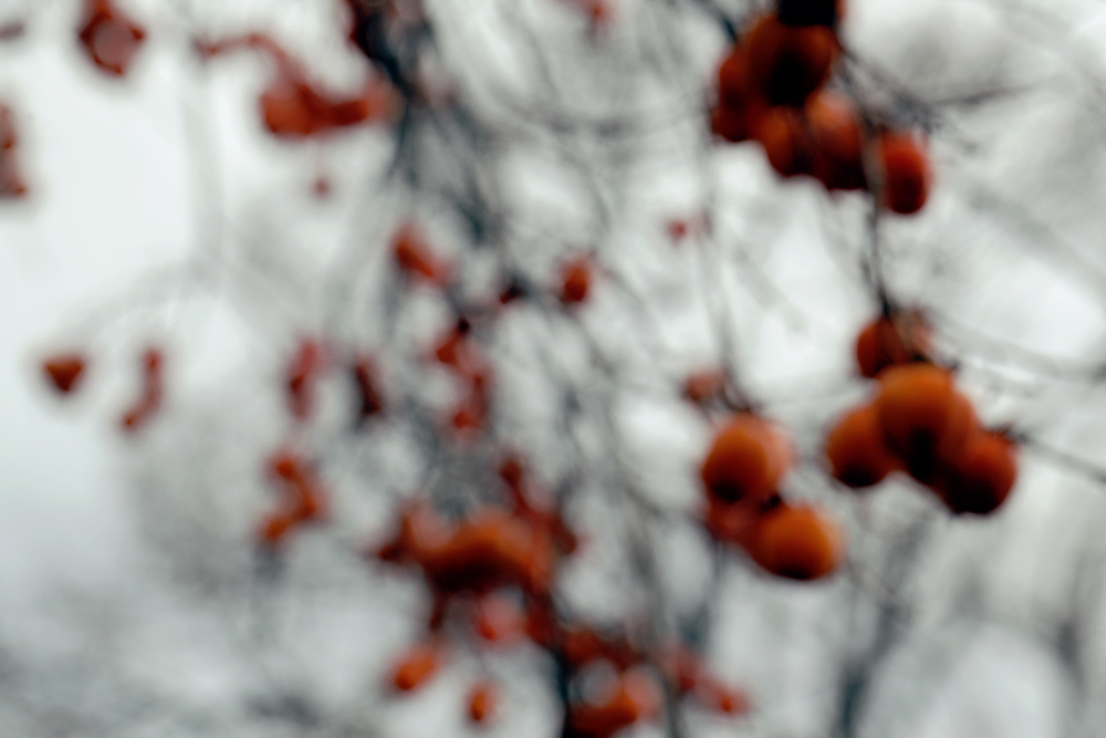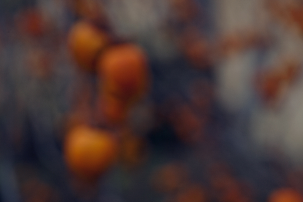 Alors que je m'en fous (aussi) de photographier un arbre devant une maison, parfois, selon les heures et leurs lumières, je faisais une photo de lui, comme ça pour rien, juste parce que c'était magnifique et comme pour me le montrer à moi même ou ne jamais l'oublier. Et puis 3 jours avant de repartir, mes jambes ont escaladé la clôture, et pendant une heure infinie et indéfinie, j'ai fait plein de photos de lui, dans un état de semi inconscience, tout en me gavant de kakis juteux que je pressais pour en gober la chair orange et translucide qui sortait du trou déchiré comme de la pâte à chichi un peu molle de sa machine sur un stand de foire. Aucune astringence ; la pulpe baveuse et sucrée s'enfonçait dans la gorge avec un goût de reviens-y simultanément délicat et pénétrant. Il faisait doux, mais le ciel était couleur de neige, un gris clair presque blanc qui rendait les fruits plus lumineux que la lumière. Un milan royal tournait à 25 mètres au dessus de l'arbre et surveillait nos ébats. C'était le Dimanche premier Décembre 2013, le jour de l'Avent...