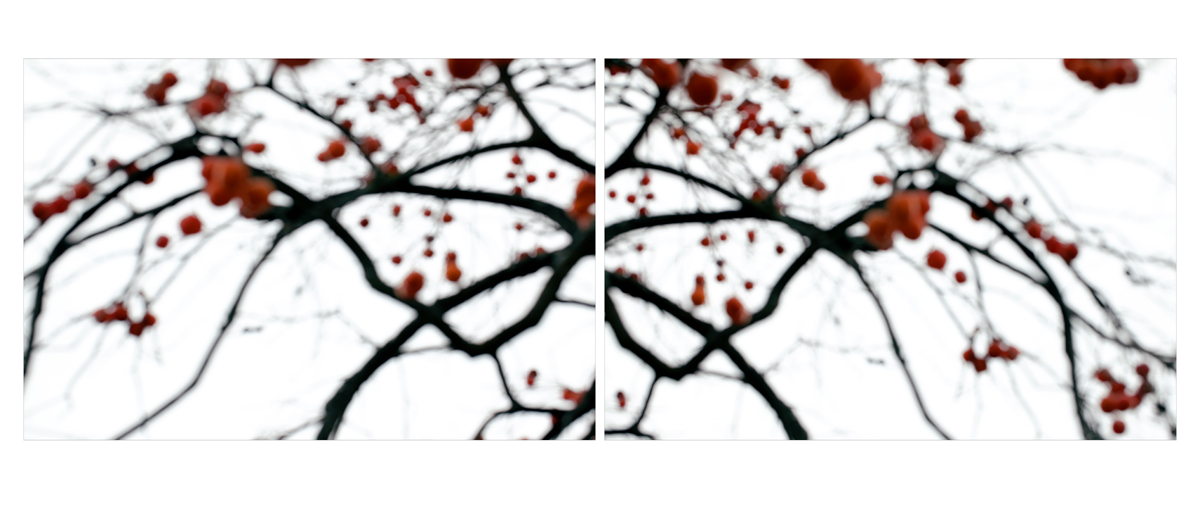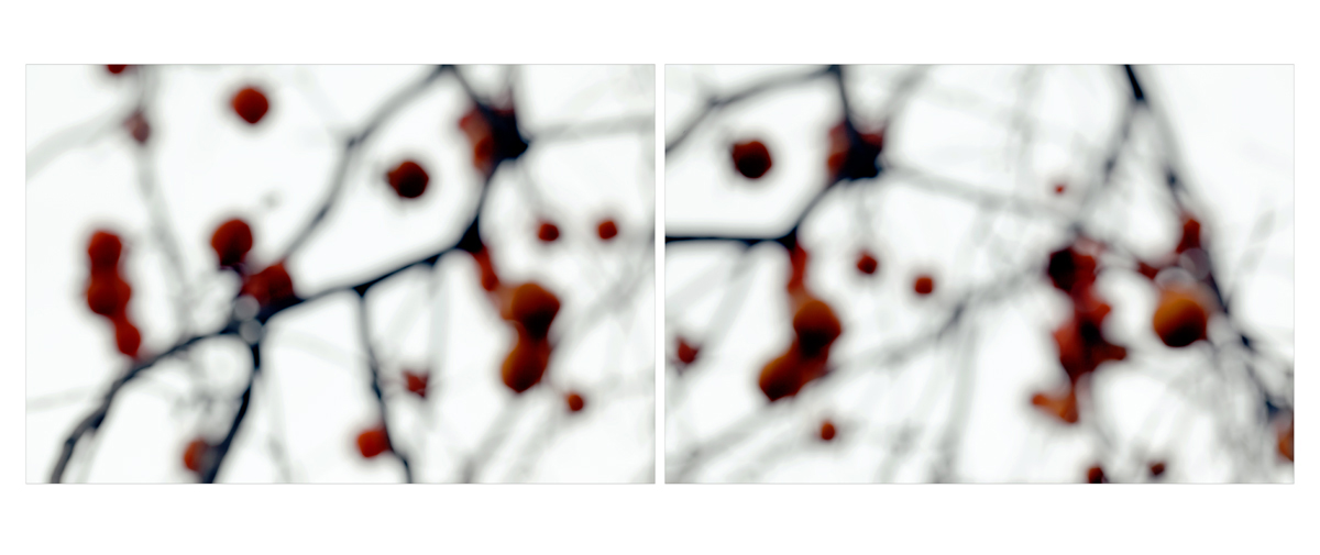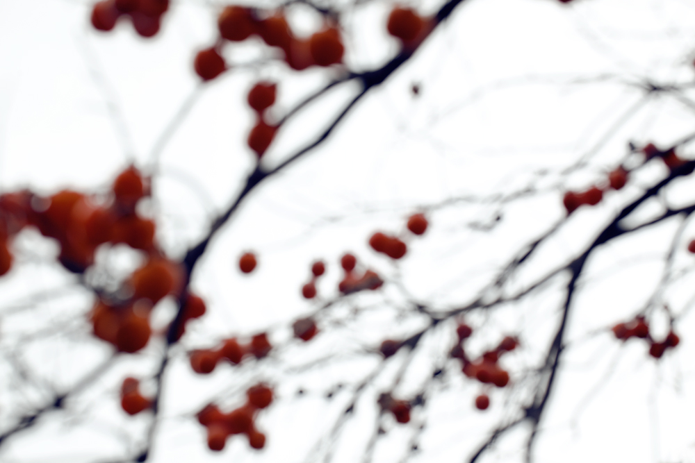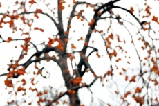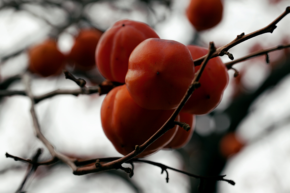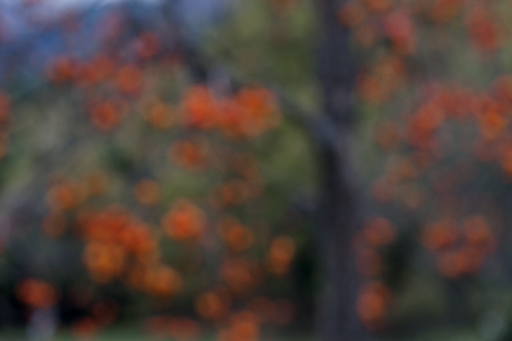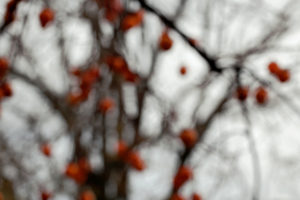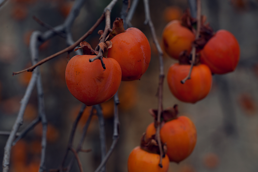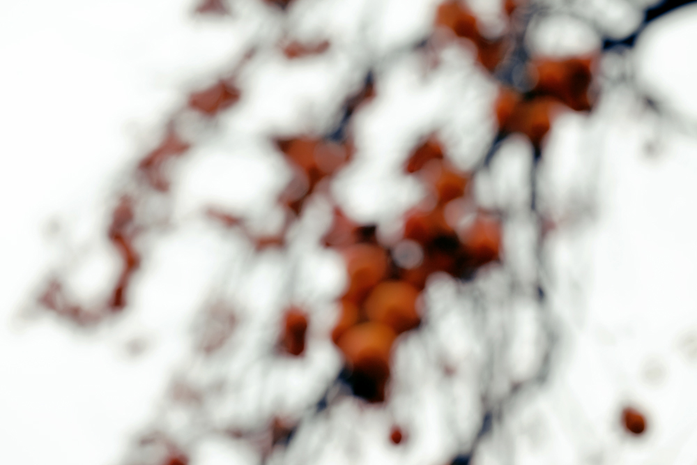 Alors que je m'en fous (aussi) de photographier un arbre devant une maison, parfois, selon les heures et leurs lumières, je faisais une photo de lui, comme ça pour rien, juste parce que c'était magnifique et comme pour me le montrer à moi même ou ne jamais l'oublier. Et puis 3 jours avant de repartir, mes jambes ont escaladé la clôture, et pendant une heure infinie et indéfinie, j'ai fait plein de photos de lui, dans un état de semi inconscience, tout en me gavant de kakis juteux que je pressais pour en gober la chair orange et translucide qui sortait du trou déchiré comme de la pâte à chichi un peu molle de sa machine sur un stand de foire. Aucune astringence ; la pulpe baveuse et sucrée s'enfonçait dans la gorge avec un goût de reviens-y simultanément délicat et pénétrant. Il faisait doux, mais le ciel était couleur de neige, un gris clair presque blanc qui rendait les fruits plus lumineux que la lumière. Un milan royal tournait à 25 mètres au dessus de l'arbre et surveillait nos ébats. C'était le Dimanche premier Décembre 2013, le jour de l'Avent...