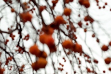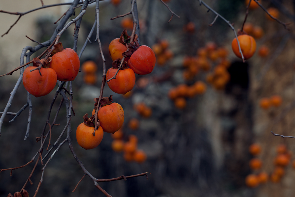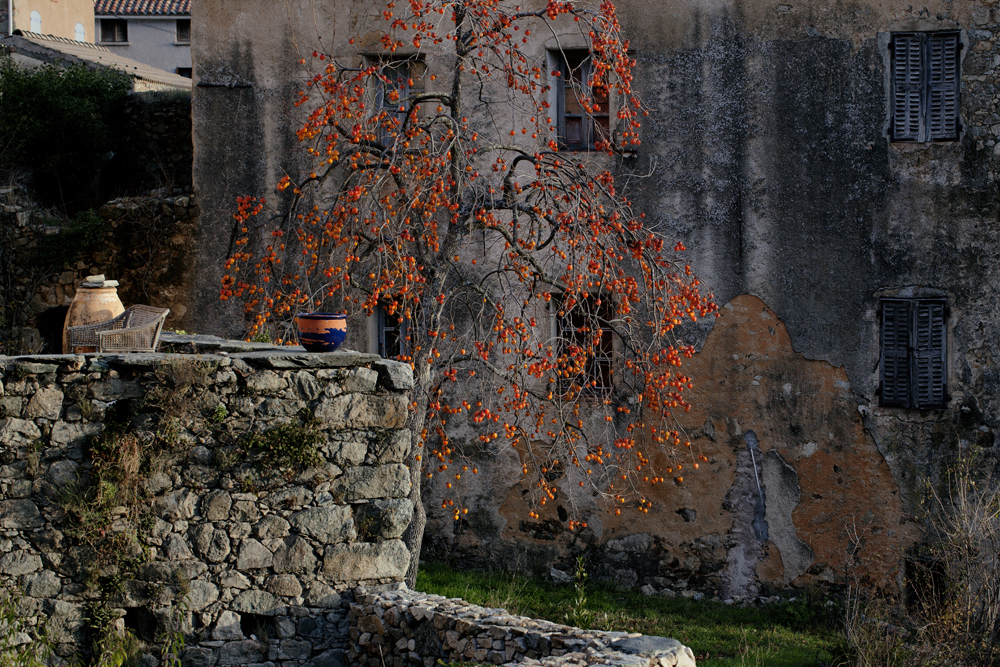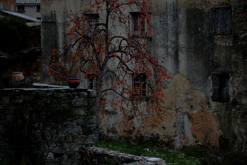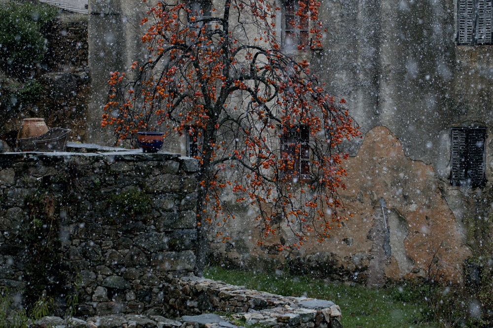 Début Novembre, en arrivant chez moi au village, je me suis comme d'habitude précipité sur la terrasse pour saluer la montagne et inspecter les jardins. L'arbre de mes voisins m'a tout de suite sauté dessus. C'est un grand plaqueminier âgé d'une bonne trentaine d'années, un peu coincé sur le côté de leur maison, sobre et discret tout au long de l'année, et qui à l'approche de l'hiver se transforme en arbre de Noël. Plus une feuille, et des centaines de grosses boules oranges et voraces de lumière. Cette année, alors que toute la flore marquait un retard de plusieurs semaines depuis un printemps tardif, lui était précoce, généreux, exubérant comme un miracle d'abondance. La beauté de cet arbre attendant la neige et le froid avec ses altières décorations fluorescentes et nourricières m'émut beaucoup.